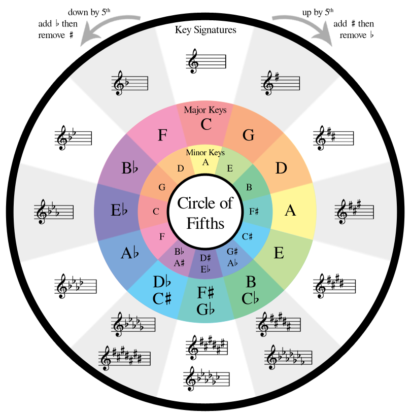 The circle is typically arranged like a clock face with C Major at the 12 o’clock position. Going clockwise in the circle is known as The Sharp Side, as each step represents ascending a perfect fifth and adds one sharp to the they key signature. Going counter-clockwise is known as The Flat Side, as each step represents descending a perfect fifth (which is equivalent to ascending a perfect fourth) and adds one flat to the key signature.